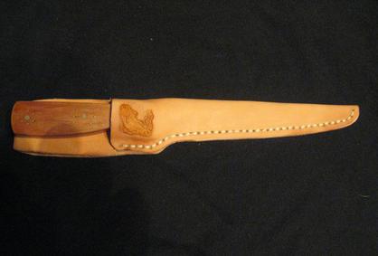 Our stainless steel fillet knife with a great NZ Totara handle in its custom sheath. This is a fold over design, double stitched with a loop style belt holder. Simple and tough.